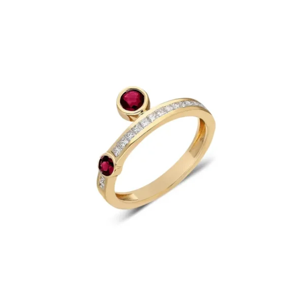Crafted in Turkey, this ring is a stunning re-envisioned version of Ita’s Buenos Dias sun ray design, adorned with rubies and channel-set princess cut white diamonds. Elevate your style with this elegant piece.
