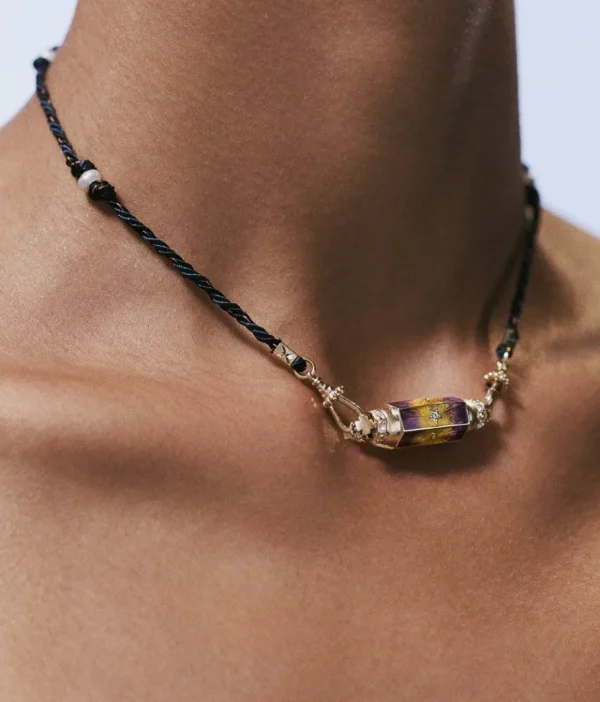 This Purple Baby Locket is a timeless piece from Marie Lictenberg, featuring a classic coco matte gold locket in a smaller size. Adorned with stunning purple and gold enamel and three engraved diamond stars, this locket is the perfect addition to any jewelry collection.